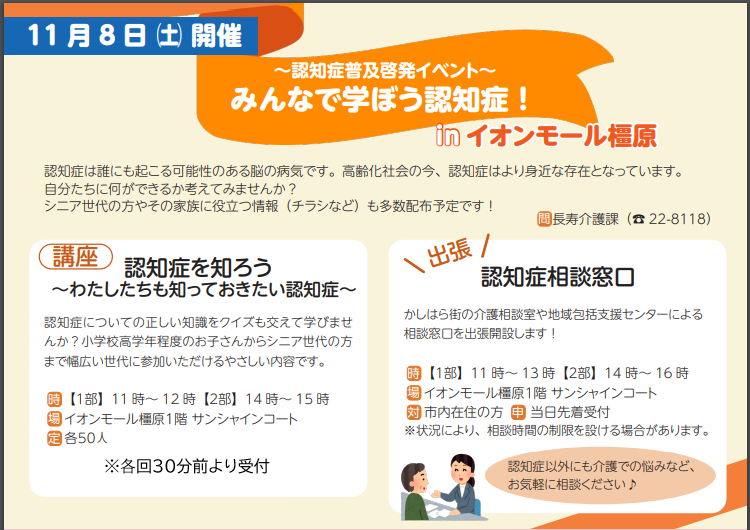 ご案内の通り、橿原市長寿介護課が主催のイベント「みんなで学ぼう認知症!」が開催されます。当日は、私たち大和三山のかしはら街の介護相談室のスタッフも参加します。私の大切な人のために、そして何よりも自分のために、まずはお気軽にお話しを聞きに来てください。人生100年時代を明るく生きるヒントが得られますよ。お待ちしております!