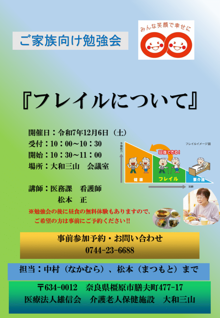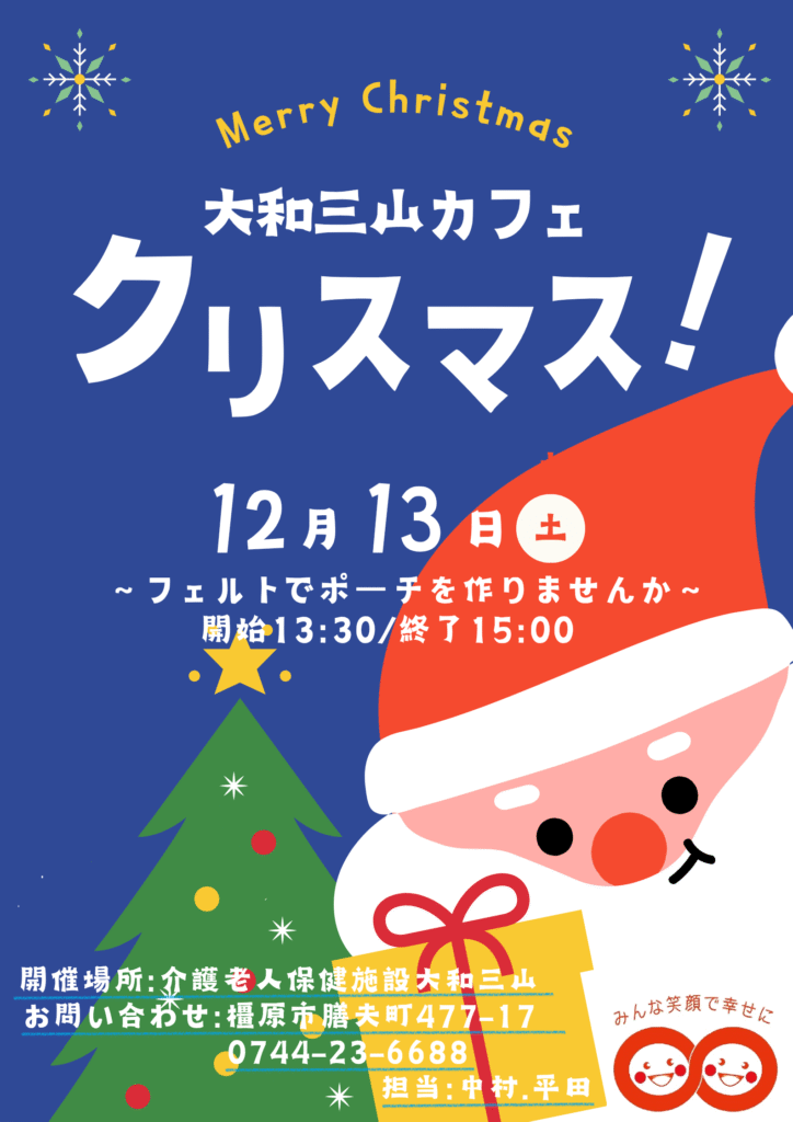 カレンダーも残りわずか、紅葉が進み初雪の便りもチラホラ、早いものですね。そんな師走12月の行事のご案内です。 一つ目は、12/6(土) 10:00~ 『フレイルについて』の勉強会です。自分の身体について詳しく知ることは、人生を有意義に過ごすためにとても大事なことです。そして今回はなんと勉強会が終わった後、無料の昼食付です!! 是非この機会をお見逃しなく。 二つ目は、12/13(土) 13:30~ 『クリスマス・フェルトでポーチを作りませんか』です。大切なあの人に、自分へのプレゼントに、みんなで楽しくかわいいポーチを作りましょう。いずれも 大和三山 0744-23-6688 まで、お電話お待ちしております!!