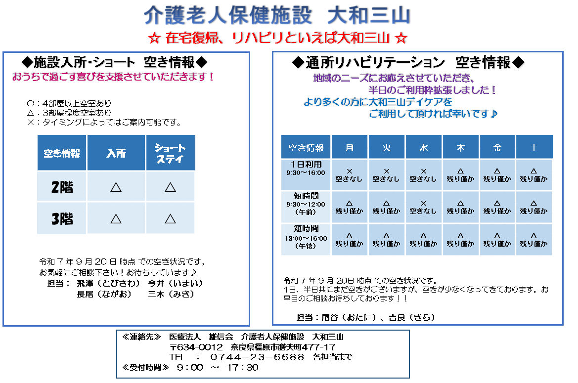 令和7年9月20日 時点での 空所状況です